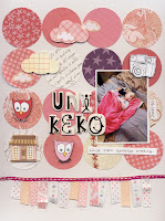 Ja kun samassa kasassa oli nuo samat kirjaimet ja tapahtumassa leikattuja ympyröitä, päätin kopioida röyhkeästi. Tai siis inspiroitua. Ja kun skräpättävien kasassa oli kummastakin tytöstä unikuvat, oli homma selvä. Pienempi sai Unikeko-sivun ja isompi leiskan, joka kertoo Wauzista (mun vanha unilelu vuosien takaa).
